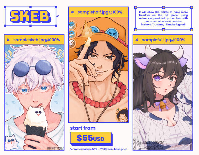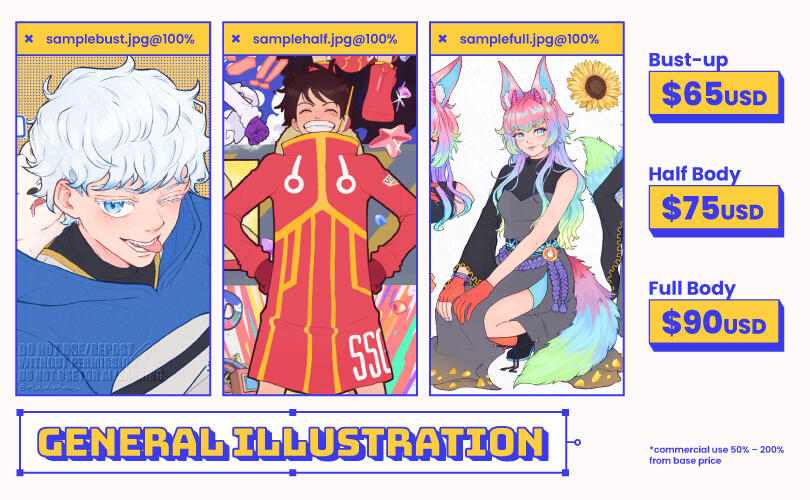 ✦) Artist might decline themes that not listed on 'Will Draw' description for personal reason.✦) Rush fee will be charged if clients want the art piece within a certain date.✦) Commercial Usage will have different rate, ranged to extra 30%-200% from base price.✦) There will be privacy fee if client doesn't wish the artwork to be publicly shared.PAYMENTS